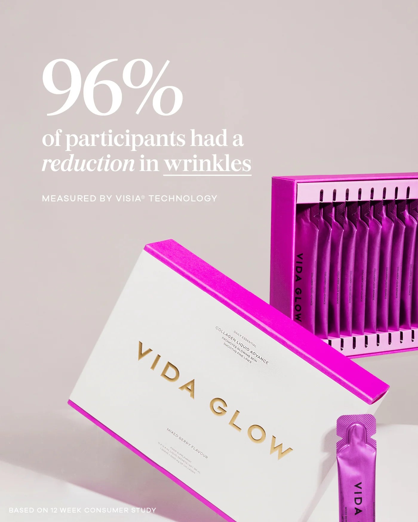 This innovative collagen liquid formulation packs a punch with 5g of Vida Glow's scientifically proven Natural Marine Collagen. Enhanced with our proprietary B-Blend4 antioxidant complex, vitamin C to boost collagen synthesis, and nourishing manuka honey, this berry-flavored elixir supercharges your journey to firmer skin, luscious hair, and resilient nails.