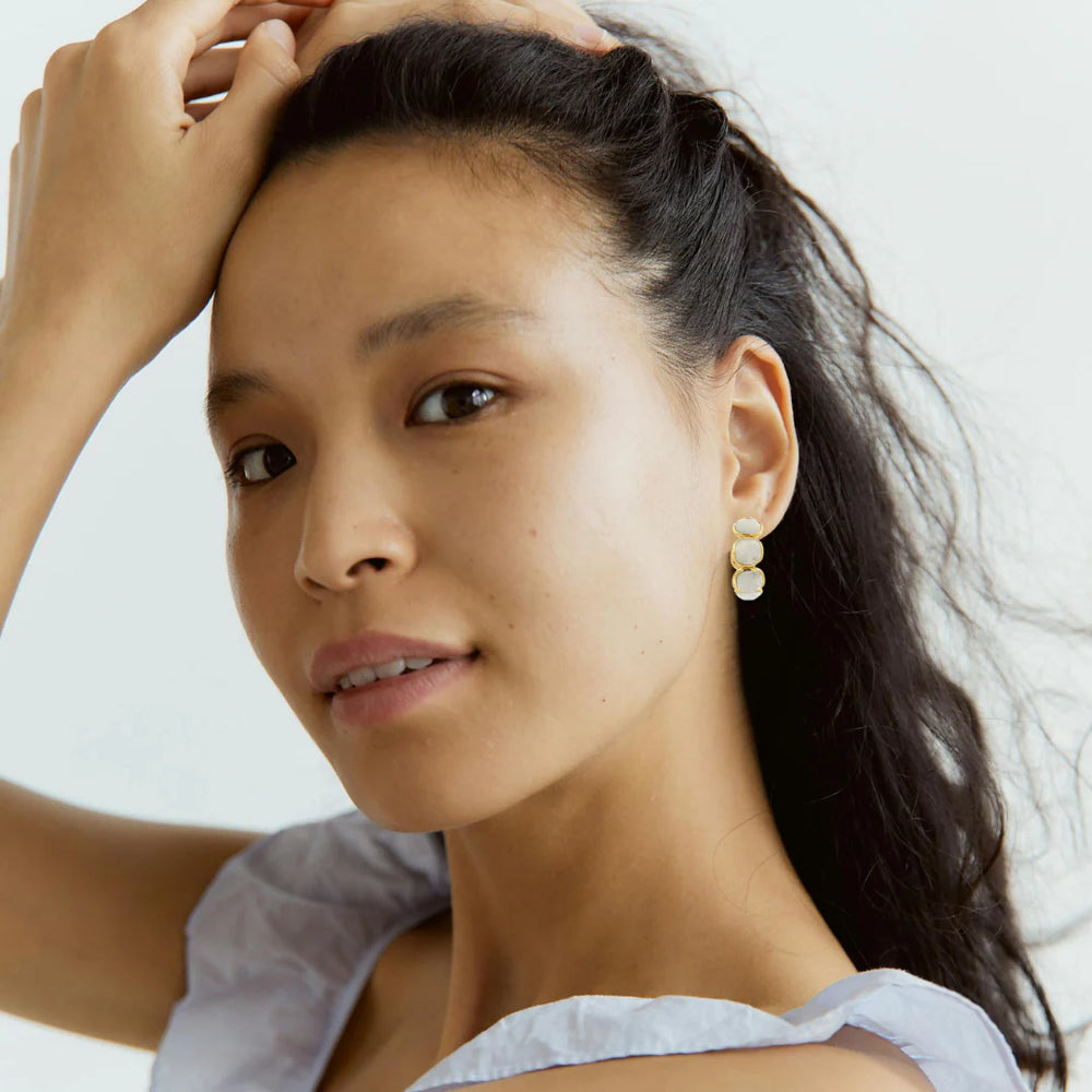 These softly squared moonstone hoops radiate quiet elegance with their gentle glow and clean silhouette. Crafted from 925 sterling silver and finished in warm 18K gold plating, each natural stone is hand-set to capture the play of light in motion. Lightweight and luminous, they’re an everyday treasure with a subtle celestial touch.