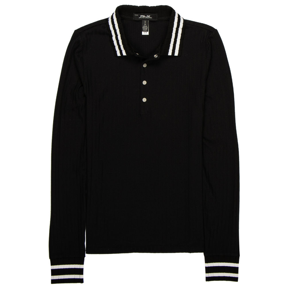 - Polo collar with striped tipping. Four-snap placket. Metal snaps custom-developed with an "RLX" logo.