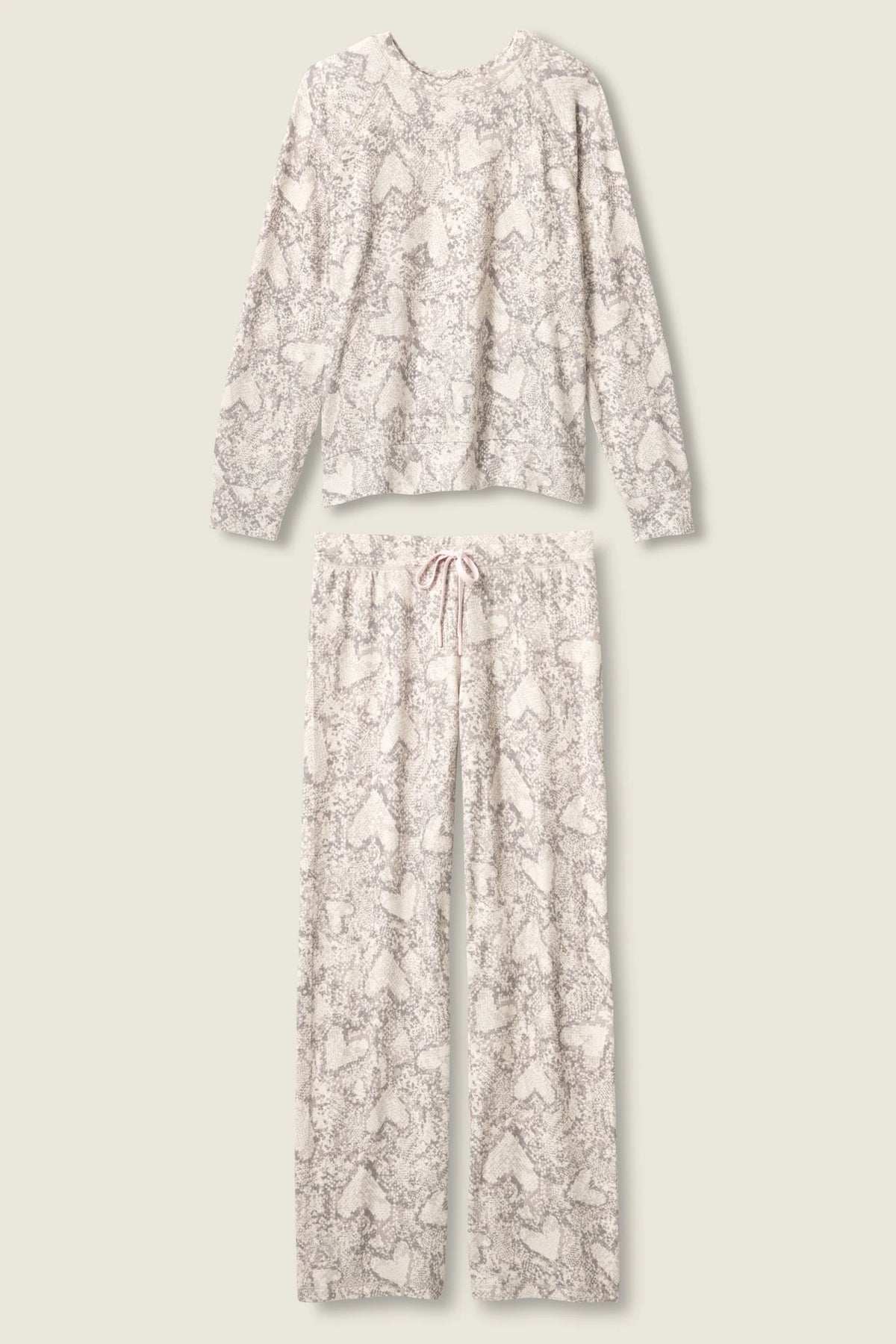 Cozy meets cool in this heart snake print peachy jersey set. The long-sleeve crewneck top and matching pants are crafted from our signature soft fabric, blending playful hearts with a subtle snakeskin pattern. Finished with a blush drawstring waist, it’s the perfect mix of sweet and modern for your winter sleep rotation.