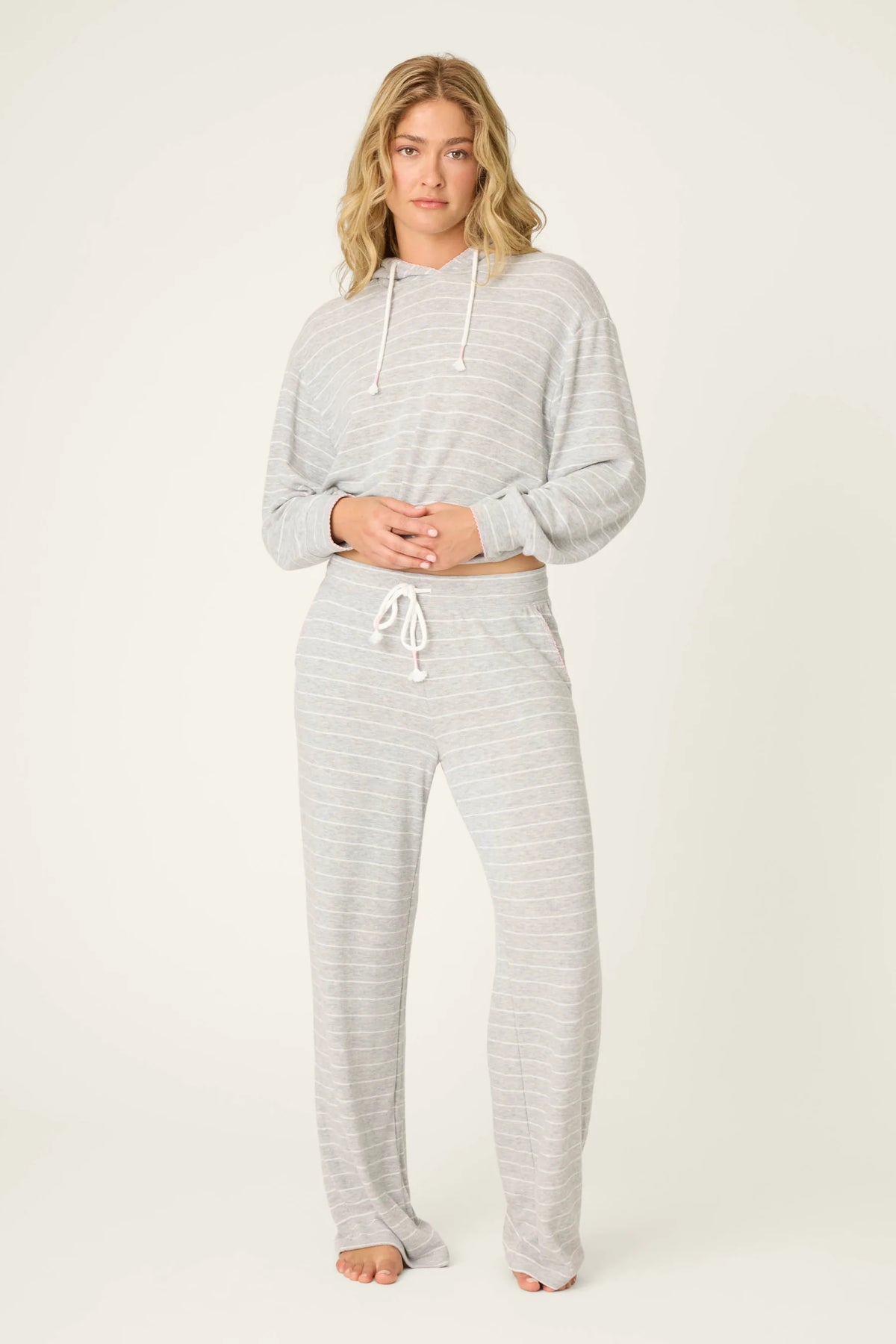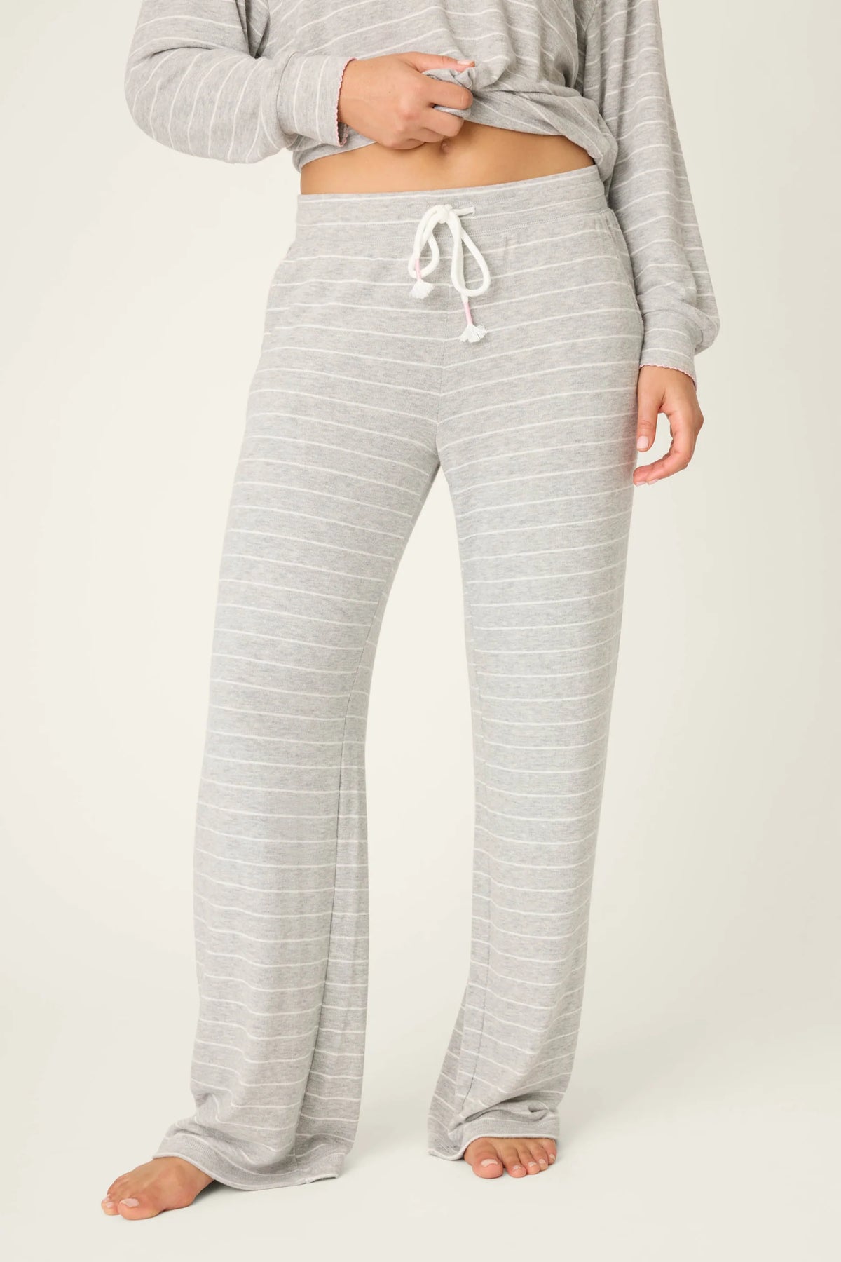 Women’s lounge pants in melange peachy jersey with grey stripe fabric, drawstring waist, side pockets, and pink scalloped trim.