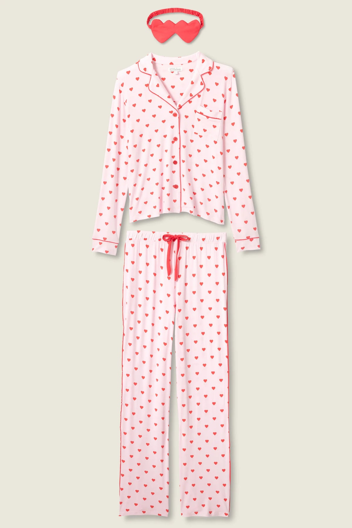 Women’s pink pajama set in soft modal jersey with red heart print. Includes a button-down top, matching pants, and heart-shaped eye mask.